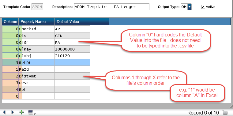 The bottom portion of the page contains fields that determine how to build the upload file. Column Number, Property Name, and Default Value tell the template how to read the upload file and where exactly to interface file data, so it will properly merge into the correct field within the given AP set.