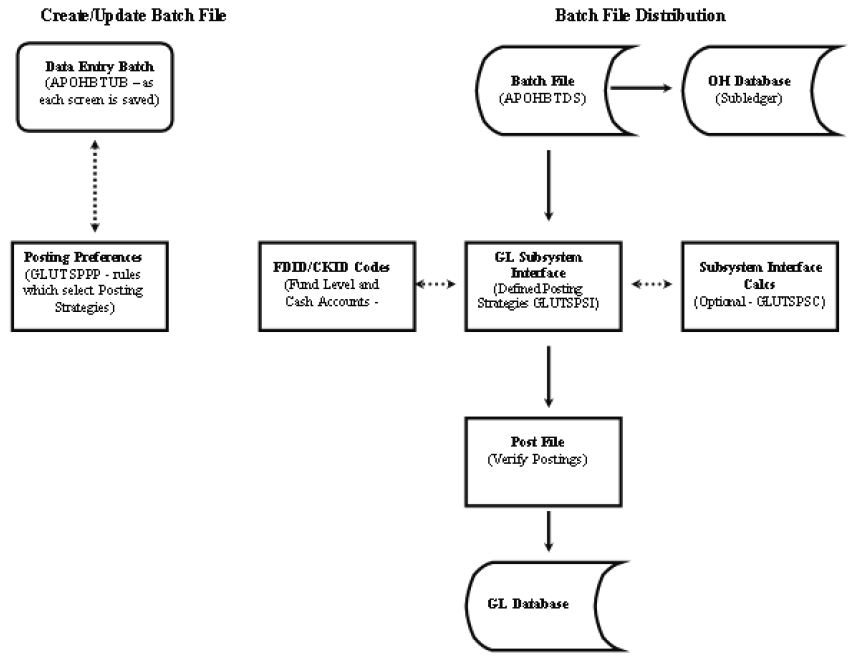 Although there is only one Posting Preferences screen for the Accounts Payable processes, there are two General Ledger Subsystem Interface (GLUTSPSI) screens. They are GL / AP / DIST and GL / OH / DIST. Typically, the GL / AP / DIST is used for Immediate Pay A/P (IP) and Void, Typed & Reversed Checks (TR). The GL / OH / DIST is used only for Open Hold A/P (OH) batches. If the GL / OH / DIST is not set up, the system will use the GL / AP / DIST posting definitions. The most common reason for setting up the GL / OH / DIST definitions is to be able to post an accrual entry to an Accounts Payable liability account when the OH batch is distributed. When this definition is in place, the GL / AP / DIST will not have an accrual entry because the IP and TR batches are to post the expense and cash to the same date.