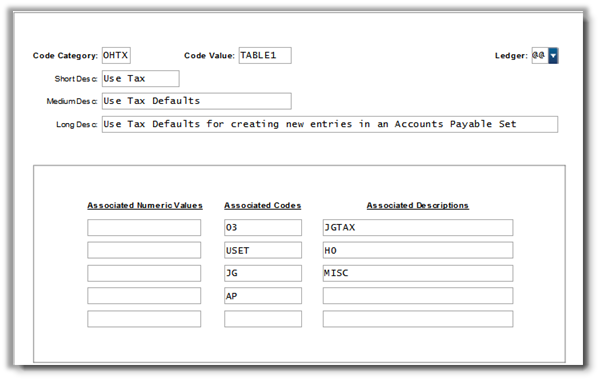The use tax setup will create amounts payable to the Vendor in Associated Description 1 and place them in a H9 status until they are selected for payment. The amount of the invoice created for each transaction depends upon the Tax Rate charged from the original vendor compared to the State Tax Rate.