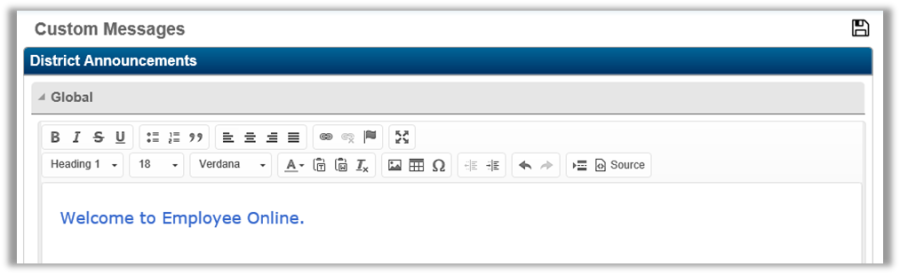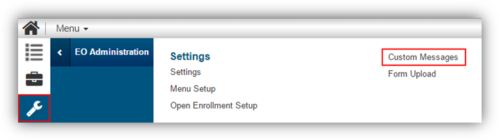 The Welcome message on the EO Home page can be customized on the Custom Messages page, Global card.