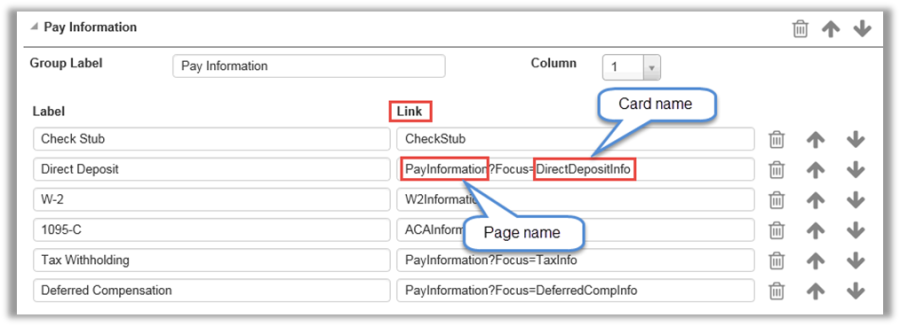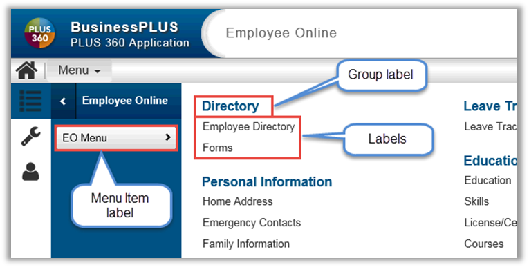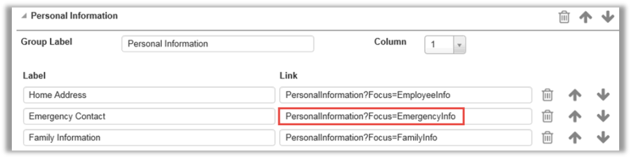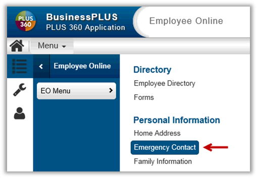 When using a card name in a Menu link, the page will open up with that specific card highlighted. For example, if the user selects Emergency Contact from the EO Menu, the Employee Information page will open with the Emergency Contact card expanded.
