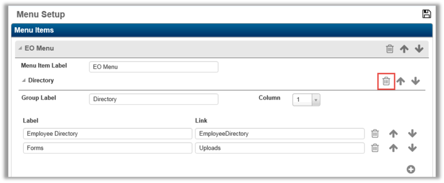 To remove a Menu Item label, Group label, or label, select the Delete (trash can) button.