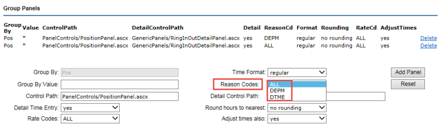 In the example below three reason code groups are defined (ALL, DEPM, DTME), which are used to populate the Reason Codes drop-down menu in the Group Panels settings on Customize Dashboard (see the Timecard Online Settings in Customize Dashboard section for additional information).