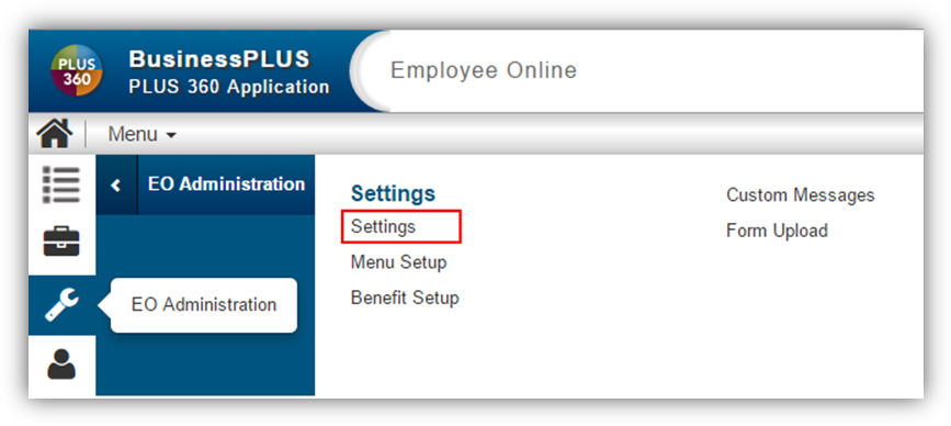 Users with administrative privileges (EOADMIN, EOSUPER) can update global and page-specific settings on the Employee Online Settings page by selecting the Settings link from EO Administration, Settings.