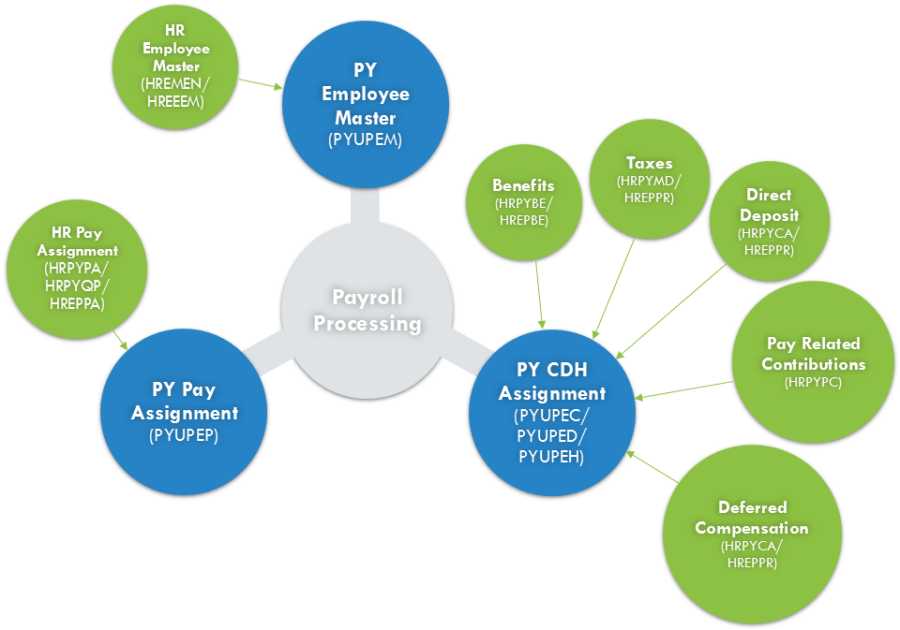 When payroll is run, the PY employee master, pay assignment, and CDH assignment information is taken into account during payroll calculations and processing.