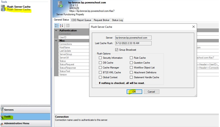 Flush the Server Cache from the Administrative Console. On the Administrative Console, navigate to 7i Server Admin, Utilities, then Monitor Servers. Click Tools, select Flush Server Cache and click OK.