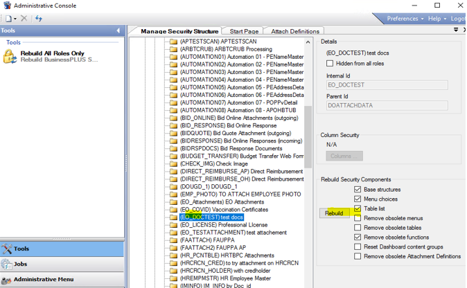After a new attachment definition is added in Documents Online, the BusinessPlus security structure should be updated in the Administrative Console. From Security Administration menu, go to Setup, Manage Security Structure, then select Rebuild Security Components.