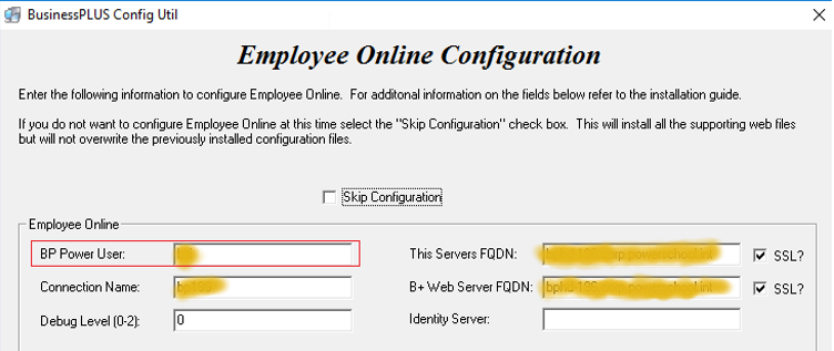 Rebuild the security for the EO power user ID. The Power User Id needs to be rebuilt for the new EO since the power user's security is required to process the upload and download requests. BP Power User Id can be found in the Employee Online Configuration. Get the BP Power User ID from Employee Online Configuration, then rebuild the user account.