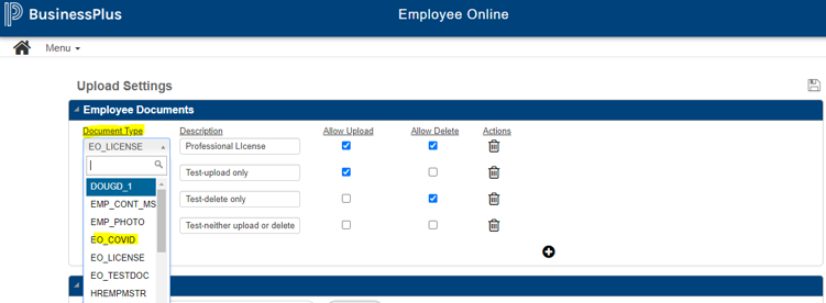 Check the newly added attachment definitions on Employee Online. From the EO Administration menu, select Form Upload. To add a Document Type, click the plus ( + ) sign, then the Document Type drop-down list. Click the desired item, change or verify the description and select the appropriate checkboxes, and then click Save. To delete a Document Type, click the trash can icon. The Document Types added here will be available for employees to select from/use on the My Documents page in Personal Information, Attachments.