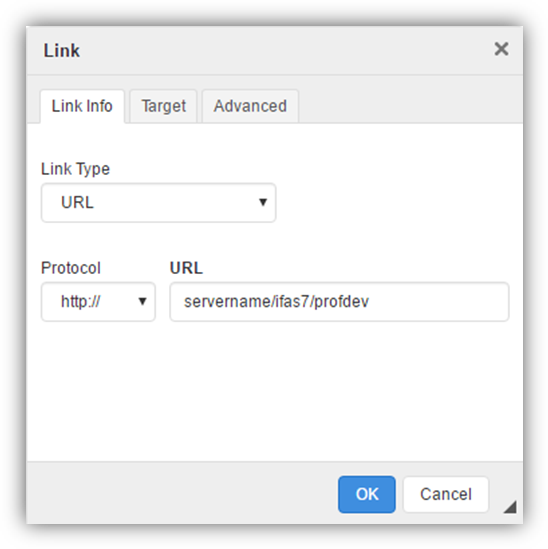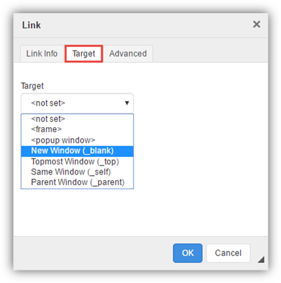 To open the link in a new window, select the Target tab. Select "New Window (_blank)" from the drop-down and select OK.