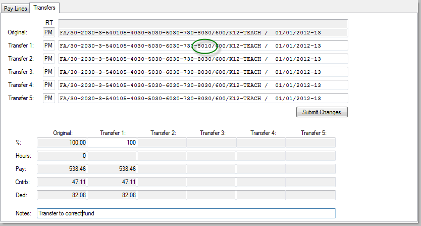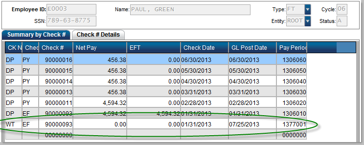 The employee will have a minimum of two records in the 77 record when viewing in the Check Details tab. One record is a full negative offset of the original pay information. The other record is the new replacement record for where the transfer will be assigned, typically a different GL Key. This is the new target line. These history records, in waiting status will be converted from WT check notes into DT completed history records when the PY Check Maintenance process (PYPACM) is run.