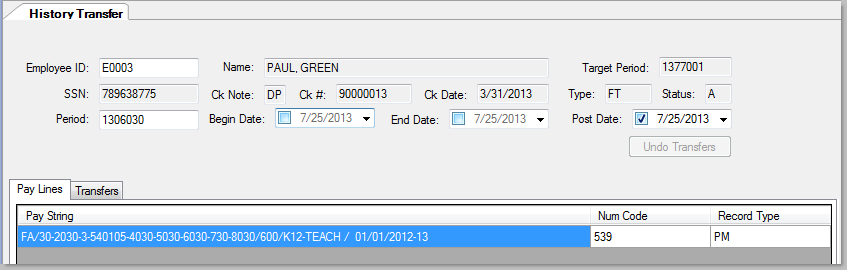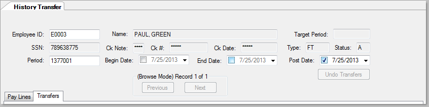 Browsing in 77 mode showing pending transfer with a target Post Date of 07/25/2013, the day of processing, today's date. Browse mode can be entered by typing 77 in the period box for the employee and pressing tab.