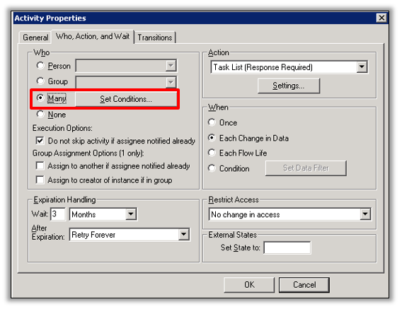 14. Click "Set Conditions…" next to the Many radio button to open the approval matrix.