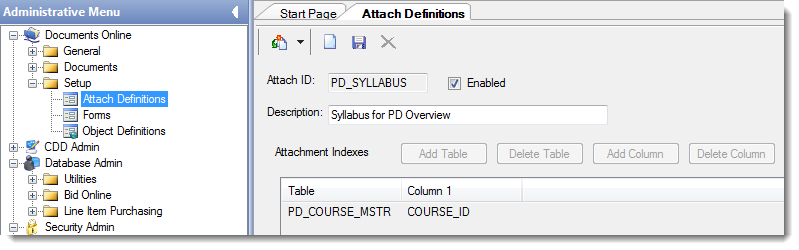 To add a new attachment definition, click on the Add Definition button. In the Attach ID field enter PD_SYLLABUS, fill in the Description and under the table column, type in PD_COURSE_MSTR and select COURSE_ID in the Column 1 drop-down. Click on "Save" when complete.