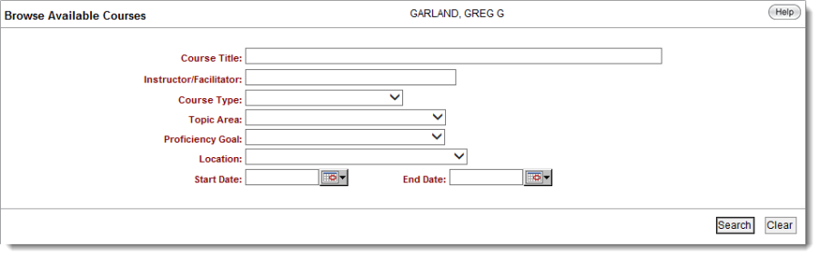 The user can browse current courses by searching with any (combination) of the fields on the "Browse Available Courses" page. If the user is not sure how to spell the exact course title or instructor's name, the user can enter a part of the name or leave the field blank.