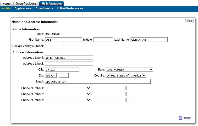 The Name and Address Information page is accessed via the My Information/Profile tab and is used for creating the applicant profile. The data is associated with the HR Applicant Master record.
