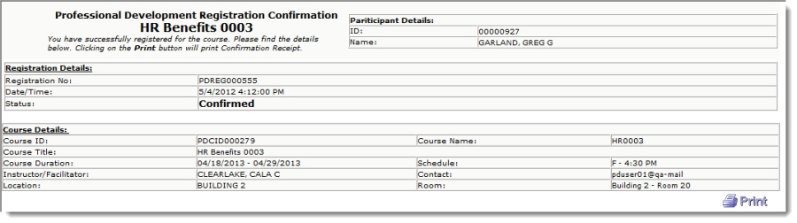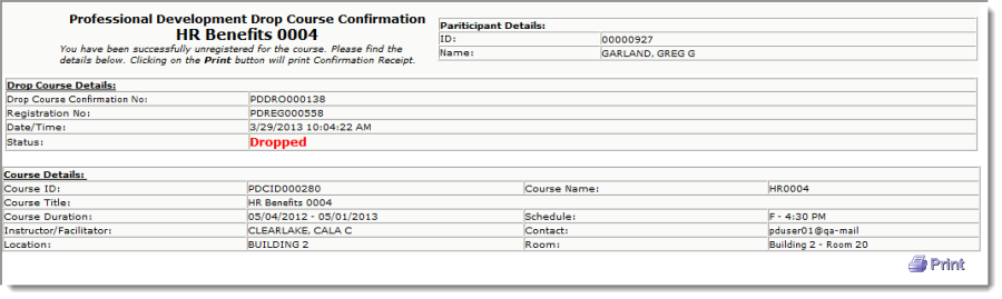 Along with an email confirmation, the following Drop Course Confirmation will be immediately displayed to the participant upon the system verification that all drop course processes have successfully completed.