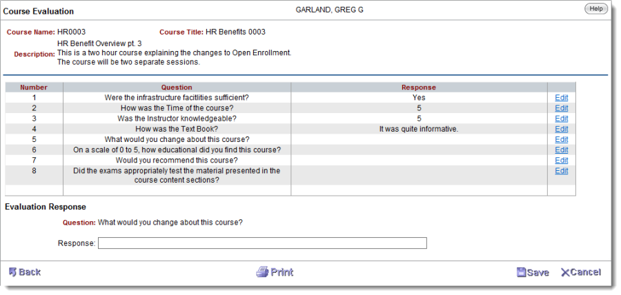 From the Evaluation link, the participant can access the Course/Instructor Evaluation survey. A course can be marked as Require Evaluation (see Course Details). The participant is then required to complete the evaluation before the Certificate of Completion becomes available. Each Course Evaluation may contain different survey questions based on the administrator's setup. Select "Save" after each question to see and save each response.