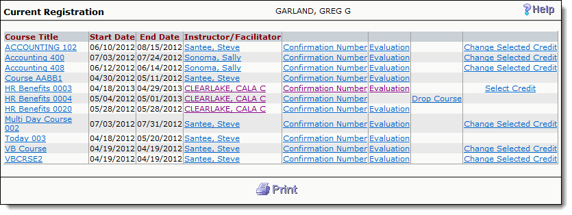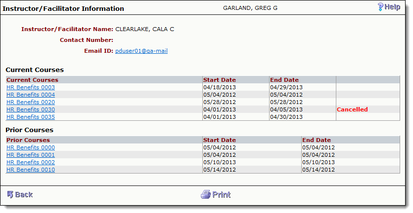 From the Instructor/Facilitator link, they can view the current and prior courses the instructor has taught.