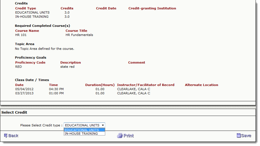 The "Change Selected Credit" process first displays the detail Course Information so that the participant may verify that they have selected the correct course to update his/her credit selection. The participant is presented with a drop-down that displays all the credit types defined for this course. Participants can make a choice of available credit types and click "Save."