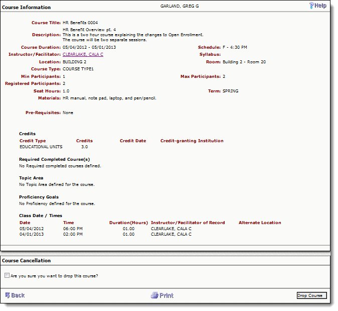 The Drop Course process first displays the detail Course Information so that the participant may verify that they have selected the correct course to be dropped. They are then presented with a dialog box to confirm that they are dropping the course. Once they click "Drop Course" within the Course Cancellation area, they are immediately removed from the course. If the course has not begun and there is a Wait List of registrations, the next participant in line will be immediately confirmed. The Drop Course action and change from Wait List to Confirmed Registration are sent via email notification.