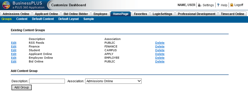 This page works just like the Default Content menu option on the Home Page tab. The items selected here will appear on the Applicant Online Home Page. The Content Groups shows on this page are those created with an identity of either "PUBLIC" or "APPLY" (there is no point in showing the others since they are not available to applicants).