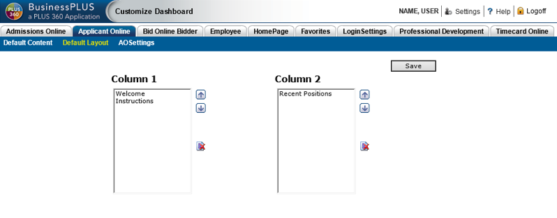 The "Column 1" items are those content items flagged with a "WIDE" size. The "Column 2" items are those content items flagged with a "NARROW" size. Once the layout is set and the user chooses "Save Changes" the Applicant Online Home page will be set.