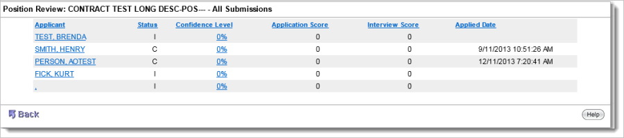 Clicking a number in the "All" column header link displays the "Position Review" page. This includes the specific applicants who have applied for a position. As submitted application information is verified/confirmed, the Confidence Level percentage and scores increase.
