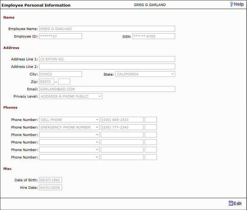 This view displays the current Name, Address, Phone, and Email information on file for the participant and provides the ability to edit that information, if this capability is defined within the security setup.