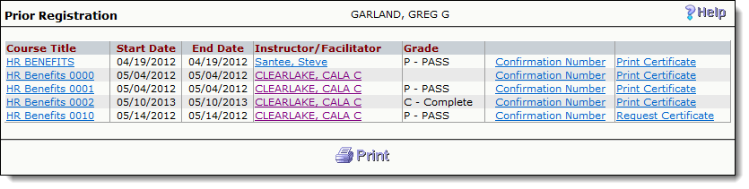 This view displays a one-line summary of previous courses completed. Links are provided to the detail Course Information, Instructor Information and provides the ability to print the Certificate of Completion (one time) if the participant received a passing grade.