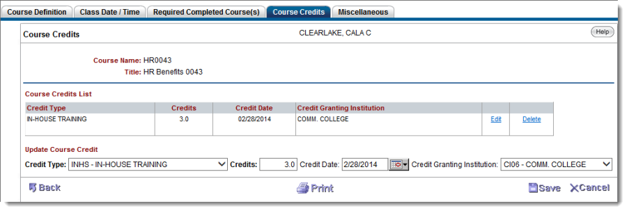 To "Edit" or "Delete" a Course Credit from in the list, click the appropriate link. "Edit" will load the course information into the Create New Course Credit section, and the name will change to "Update Course Credit." Once finished, click "Save" or press "Enter" to update the course credit.