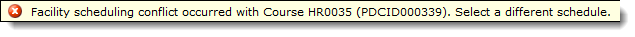 The Instructor/Facilitator will receive a message alert in the event a course has facility conflicts with other Active or Inactive courses. This will avoid scheduling overlapping courses by the same Instructor/Facilitator and/or for the same location on the same date and timeframe.