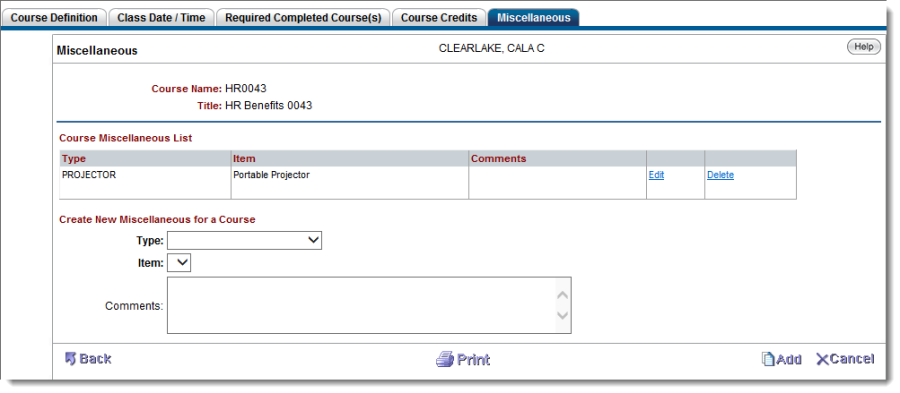 To navigate back, click "Back" on the lower left-hand corner of the page. To add/modify miscellaneous items for a course, select the "Miscellaneous" tab. To add a new item, select the "Type" and relevant Item(s) from the drop-downs. Comments are optional. Select "Add" or press "Enter" and continue until each type(s) is defined.