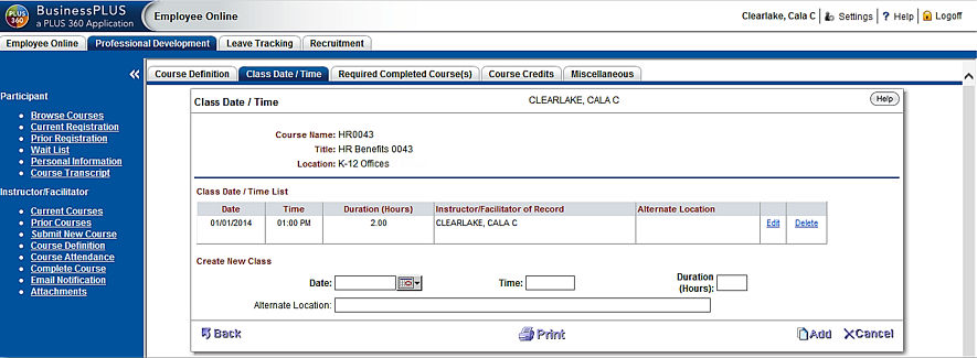 Once this process is completed, the course will display online as Active and participants are able to register. The instructor will view it as Active in the Course Status column on the Course Definition page. On clicking "Save," from the Add Course window, the page automatically moves the instructor to the Class Date / Time tab. When not in Add mode, the Instructor can select the "Class Date / Time" tab to update the Class Date / Time details.