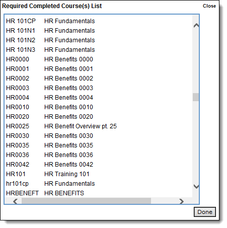 To add a new Required Completed Course, select the lookup box next to Select Course Name to see a listing of all courses created in PD. Highlight the course you would like to select and click "Done" in the lower right-hand corner of the page. The course will display in the Select Course Name field. To complete the association, select "Add" or press "Enter."