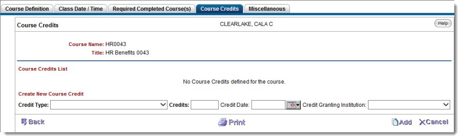To add/modify credits for a course, select the "Course Credits" tab. Each credit will be listed here. To add a new credit, select the credit type from the drop-down and enter credits. Credit Date and Credit-Granting Institution are optional. Select "Add" or press "Enter" and continue until every credit(s) is defined. The page will verify that no duplicate Credit Types are selected.