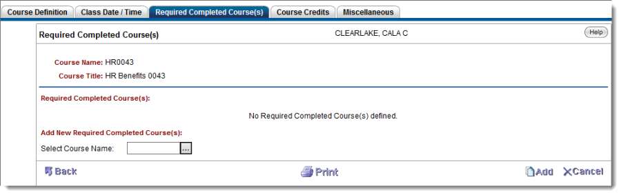 To add/modify Required Completed Course(s) that must be completed before taking a course, select the "Required Completed Course(s)" tab. PD courses will be listed here. When an applicant registers for a course, verification will automatically occur to ensure the applicant has completed the selected Required Completed Course(s).