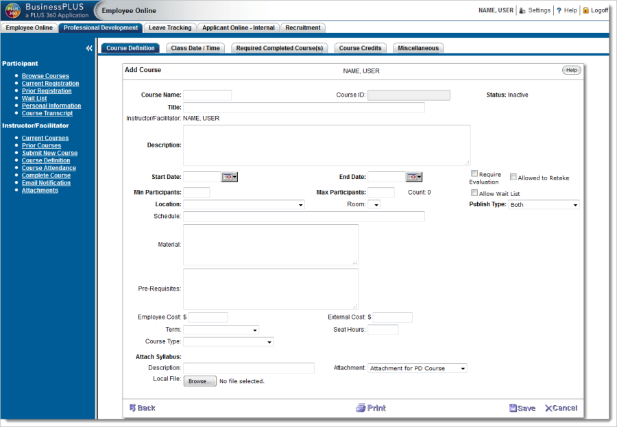 The instructor enters all of the relevant information for the course definition. Required fields are: