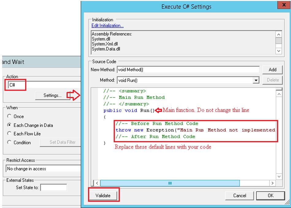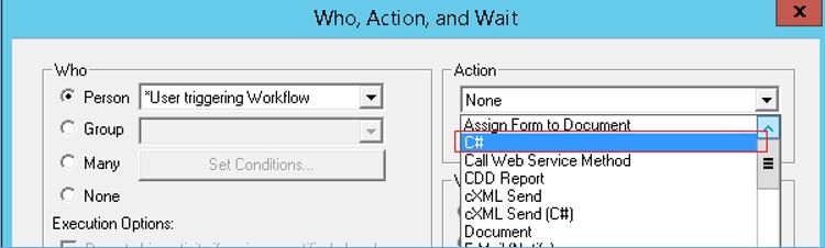 In the Workflow Designer application, select "C#" from the Action drop-down menu in the Activity (documentation found at Workflow Designer/Definitions - WF/Activities) dialog. Next, select the Settings button to open the Execute C# Settings dialog box.