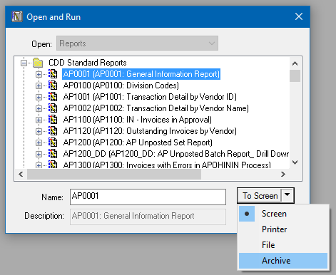 To archive a report in Click, Drag & Drill, you must first run the report. From the "Open and Run" dialog, select the report and criteria, then change from To Screen to To Archive using the drop-down menu.