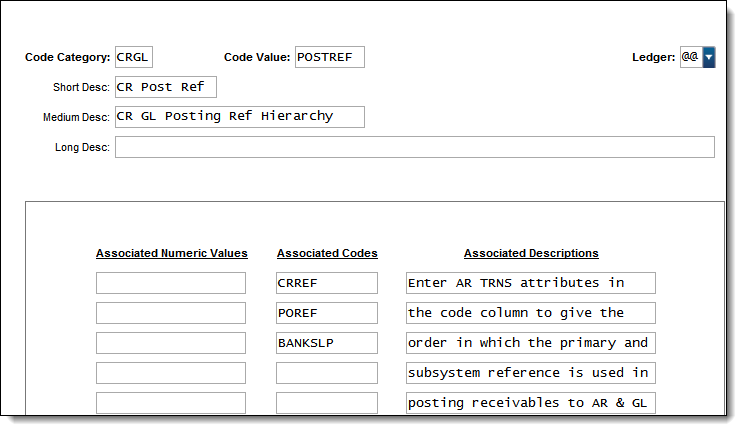 This common code sets the CR General Ledger Posting Reference Hierarchy. The hierarchy for the GL Primary and Secondary References can be specified for the detailed level posting by placing the list of AR transaction attributes in the Associated Code column. Place the attributes in order from code (1) to code (5) based on the priority to be used. The first non-blank code found will go into the primary reference field; the second non-blank code will go into the secondary reference field. The attributes that can be used in the Associated Codes column can be found by running NUFLAT for subsystem AR and cluster TRNS. Only the attributes from the TRNS cluster can be used.
