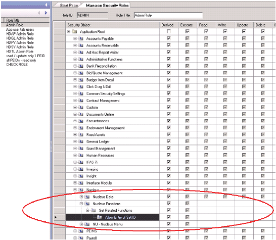 The security settings for a specific role may change depending on the type of security object. For example, when viewing Fixed Asset menus, the user may only see one checkbox for "Execute" as opposed to Fixed Asset Data that has checkboxes for Read, Write, Update, Delete and Execute.