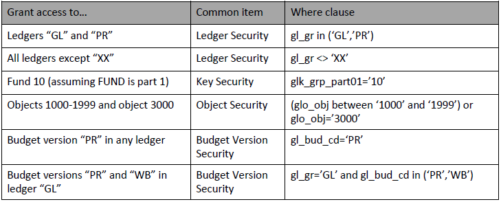 An SQL "Where clause" can be entered to restrict access to specific portions of the BusinessPlus data. Each common security item corresponds to a database table, so any column within that table may be used to control security. Below are some simple examples of security that can be granted using the General Ledger common items.