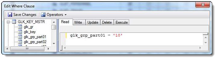 Below is an example of the Edit Where Clause screen. Note that the Where clause has been written for the Read attribute of the associated table, the GLK_KEY_MSTR. It is possible to include Where clauses for each of the attributes of the table: Read, Write, Update, Delete, and Execute.