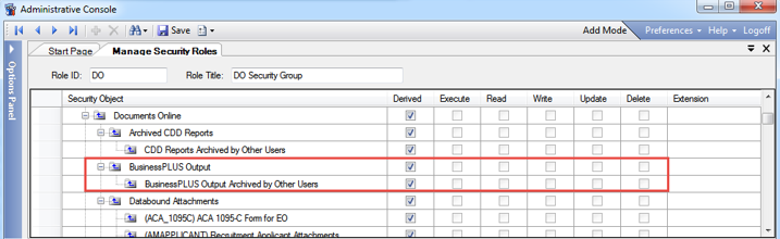 Users need to be assigned security permissions to archive BusinessPlus output. This configured under the security administration section for Manage Security Roles in the Administrative Console.
