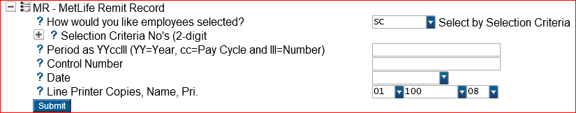 The process uses standard selection criteria to determine which employees will be included. In addition, a payroll period needs to be provided so the process selects the data from the appropriate timeframe. The control number and report date are used in the header record of the remittance file.