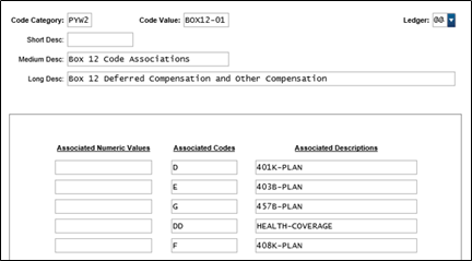 ⚠️ Value definitions (e.g., 401K, 403B) must be unique and used only in the common code setup. They cannot be used elsewhere in the W-2 setup.